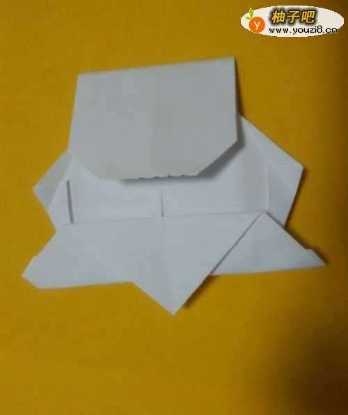 7将向下折打三角压平后,向上折个三角。观察图中红色圆圈部分,再向内折两个小三角。如图所示。
