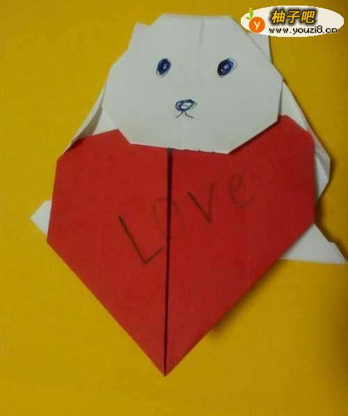 小熊抱爱心是不是很可爱呢,关于爱心的折法大家可以在我以前的经验里面看,在这里我只介绍小型的折法。认真学哦。