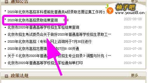 4进入高考高招栏目,在通知公告中点击【2020年北京市高招录取结果查询】;
