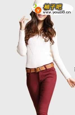 3修身的小脚裤,深些的颜色适合冬季穿着,随意简单的搭配更加修身显瘦。