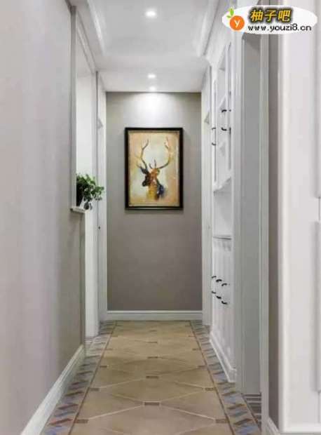 9走廊地面四周做了彩色边线,整体暖灰色的墙面,在走廊尽头挂上一幅鹿头装饰画,右侧墙面还与次卧共享墙面做了收纳柜,为房子保持优雅整洁的摆饰提供了储物保障。
