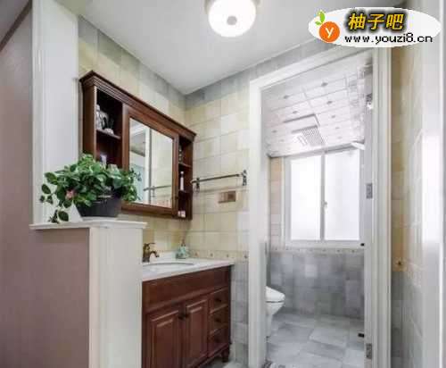 10卫生间洗手盆与走廊之间隔了一个小矮墙,矮墙台面装了大理石并摆了一盆绿植,过卫生间与走廊都浪漫了清新的气息。灰紫色的地砖墙脚+浅黄色墙面砖,让卫生间显得冷静而又温馨。