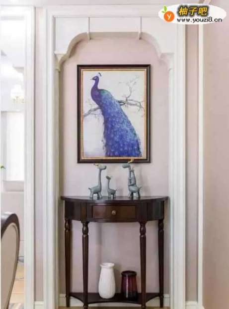 进入玄关,棕色仿古砖地面与深木色的端景台、孔雀挂画让空间显得端庄气质,而奶咖色的墙面与白色踢脚线、框线装饰,则为空间带入了几分浪漫优雅的气质。