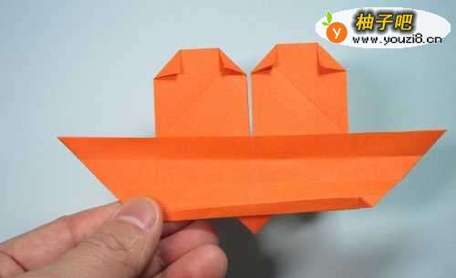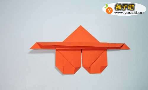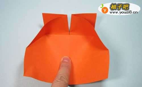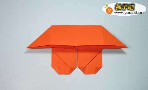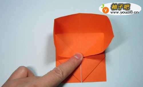 9第9步、将上面竖着的那条边,沿着折痕压折下来,左右两侧形成两个尖角。