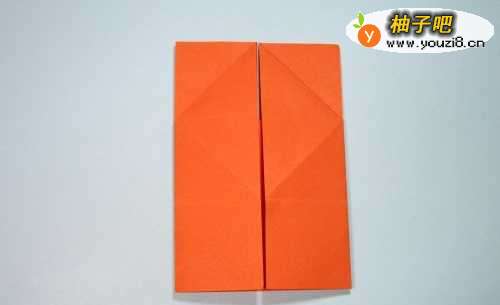 6第6步、上一步折好后,发现有左右两条边无规则竖着的,将这两条边分别折向中间折痕,得到这个形状。