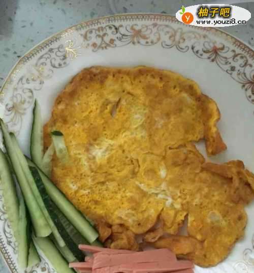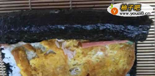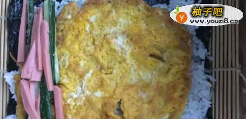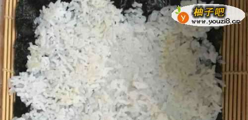 2将米饭平铺到竹帘上边,四周要留出空余地方,将煎好的整个鸡蛋,平铺到米饭上边。