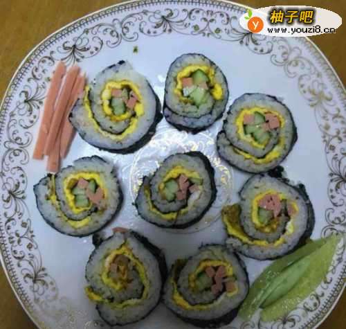4等所有的配料放好,然后沿着一边卷起,记得要紧,等寿司卷好以后,然后切成一段一段,放入盘子,加一些点缀就可以吃了。