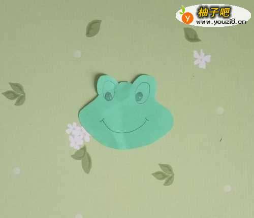 拿一张绿色纸来,在上面画青蛙的头像,并剪下来,如图所示。