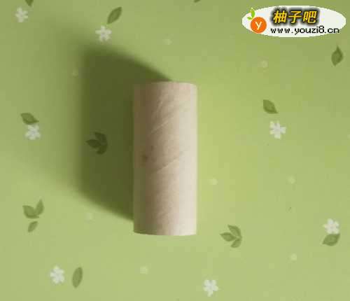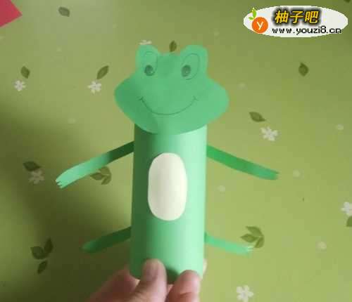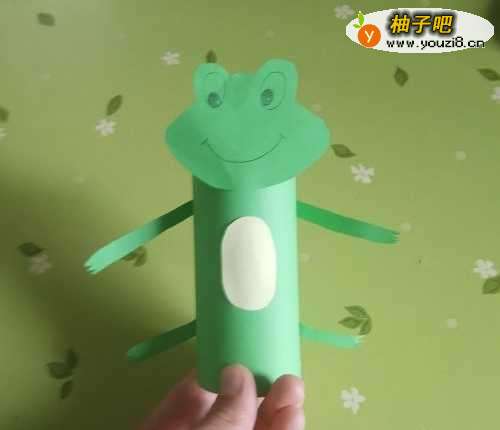 3现在用到纸筒,并用绿色纸包上去,当青蛙的身体,如图所示。