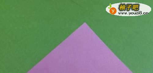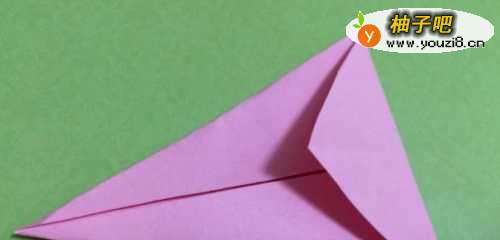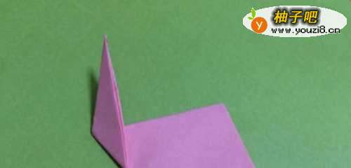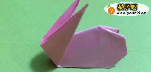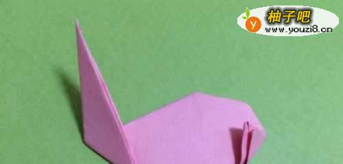 4把上一步小脚折到里面,右下角上折一个小角打后打开,也折到里面,头部耳朵剪开,折向两边后耳朵缝隙撑开。