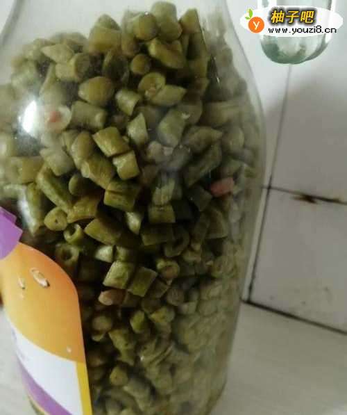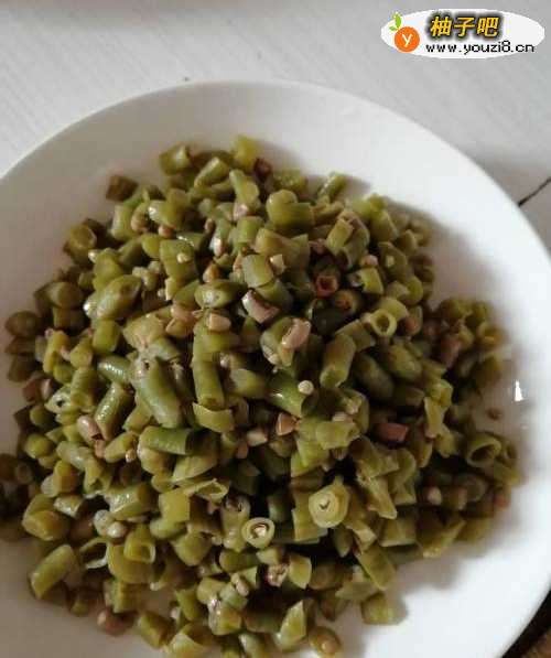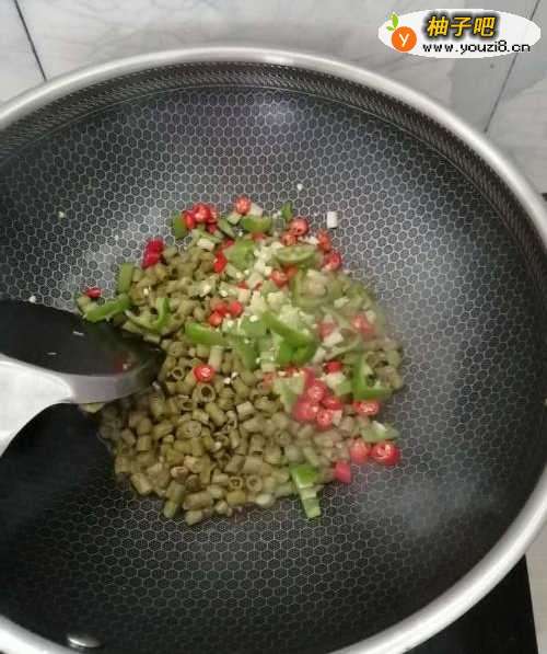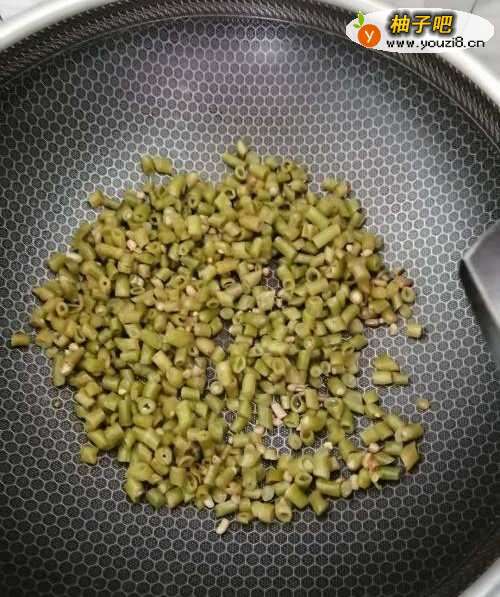 3起锅烧热,先不要放油,将酸豆角倒入锅中翻炒,炒干多余的水汽后再倒适量油翻炒均匀。