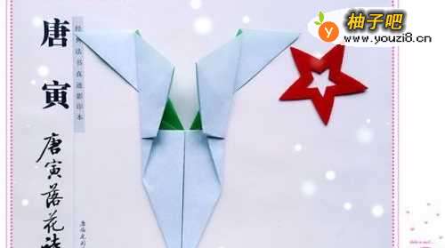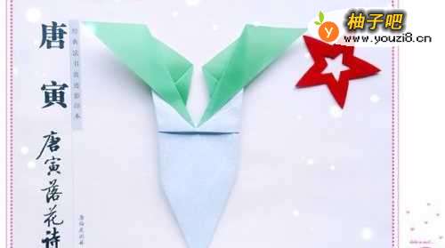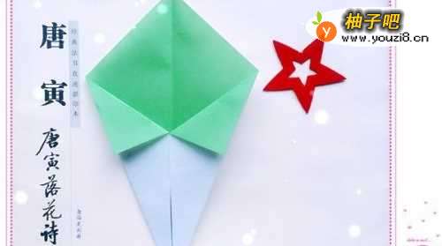 5把剪开的两个角分别按照图中的方式往外翻折,如图所示。折好的两边要尽量对称,注意最后折出的成品才会好看。