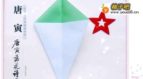 2把有颜色的那一面先沿着其中的一条对角线进行对折,再把对角线两边的角往内折,如图所示。