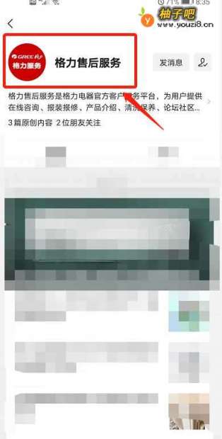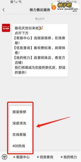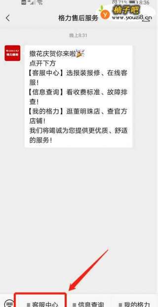 3进入【格力售后服务】公众号后点击左下角【客服中心】