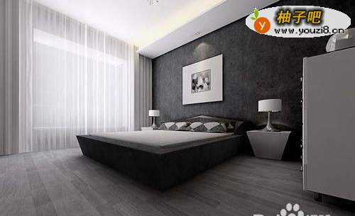 简单的黑白两色构成主色调,纯黑的墙面、铺天盖地的更衣柜、木地板,构成一种比较前卫的卧室布置,而上部裸露的白墙、天花板上白色吊灯、白色地垫这些大面积的白色调又调和出整体空间的纯洁美感。床头的橙红靠板、更衣间的橙色座椅,映衬着黑色床框,分外鲜明生动。
