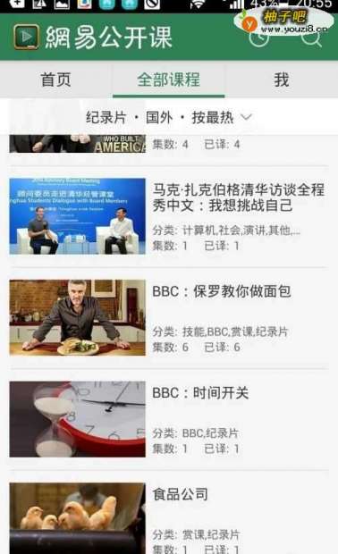 3另外一个方法,可以点击首页上面的全部课程,出现下面的界面,然后,比如说,我想选择国外最热门的纪录片,就可以一次按下“纪录片”--“国外”--“最热”这几个选项。