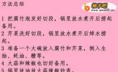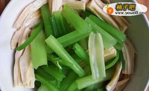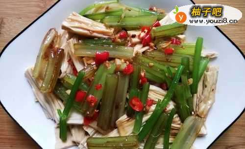 8把烧热的大蒜辣椒油淋在腐竹芹菜上,拌匀即可,这样拌的腐竹简单又好吃哦。