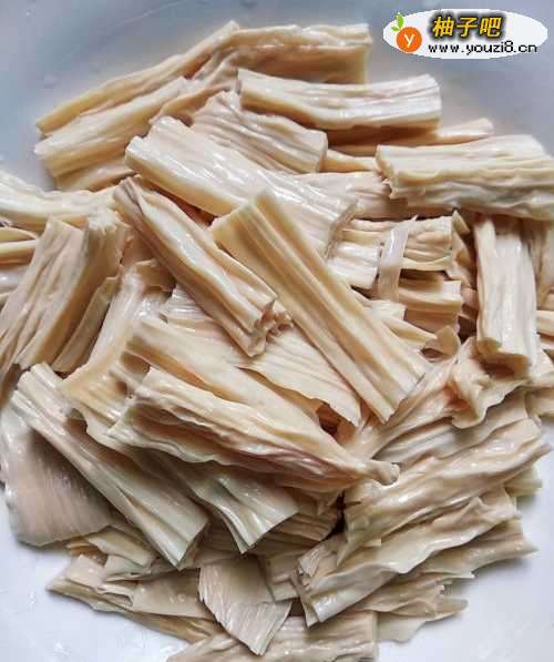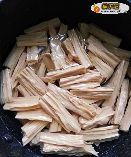1 把腐竹泡发好切段,锅里放水煮开后捞起备用。