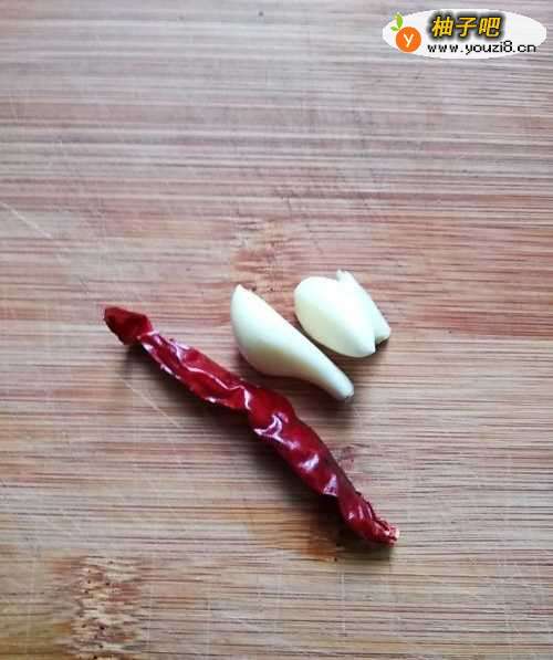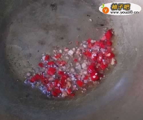 7锅里放油烧热,放大蒜辣椒炸香,如图所示。