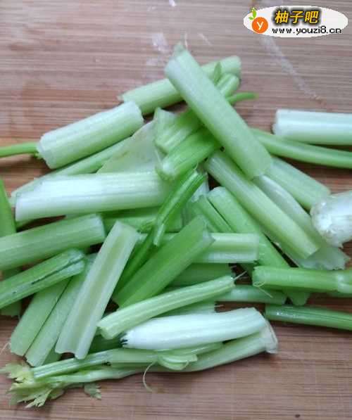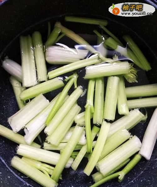 2 芹菜洗好切段,锅里放水煮开后焯水捞起。