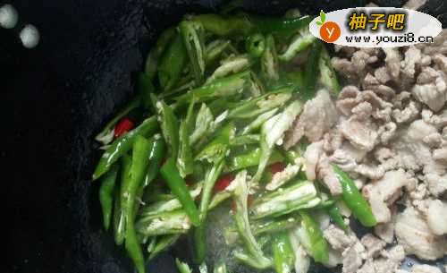 3猪肉铲至一边,放入青椒和大蒜翻炒出香味