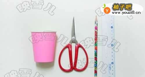 材料:纸杯、剪刀、尺子、笔。