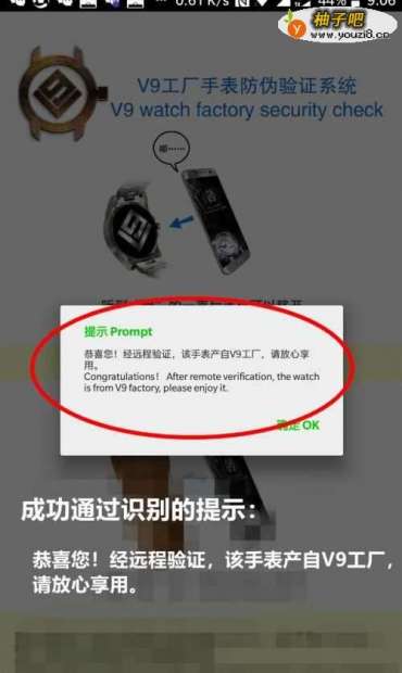 恭喜您!经远程验证,该手表产自V9工厂,请放心享用。