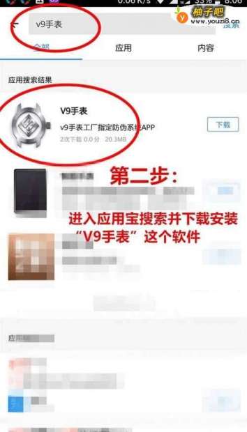 3在应用宝中搜索并安装“V9手表”这个软件,V9工厂只授权了应用宝可以下载到这个软件,这也保证了软件的唯一性和安全性。如果其他应用商店能下载得到的就说明是假的。