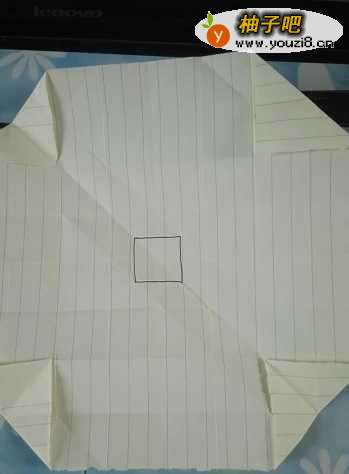 4再将纸张对折两次,成钻石状,再将下方的尖角折上去,展开后中间会有一个小正方形。