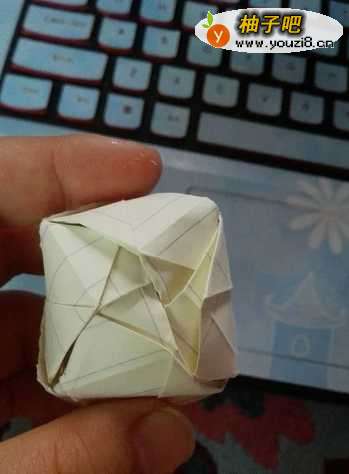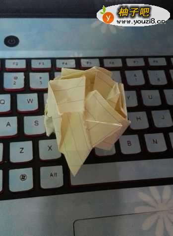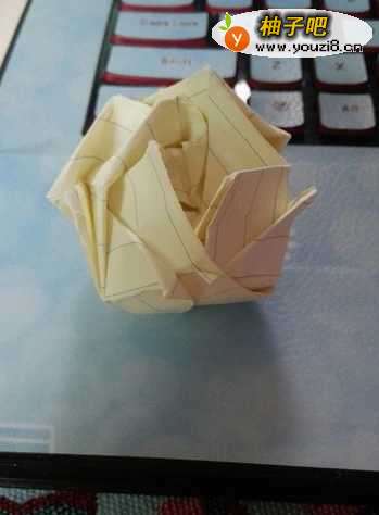 11将玫瑰翻过来,逆时针将多出来的长条折进去,最后一个长条压在第一个长条下面。