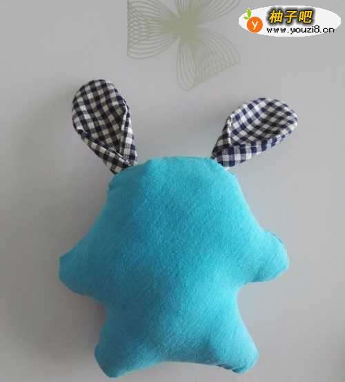 8接下来把另外一片主体布片盖在这块上面,将两只耳朵夹在两块布片中间~然后沿着布块边缘将布块缝合起来~缝的时候要留出反口~