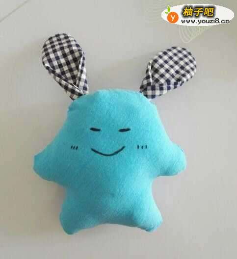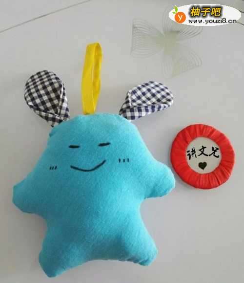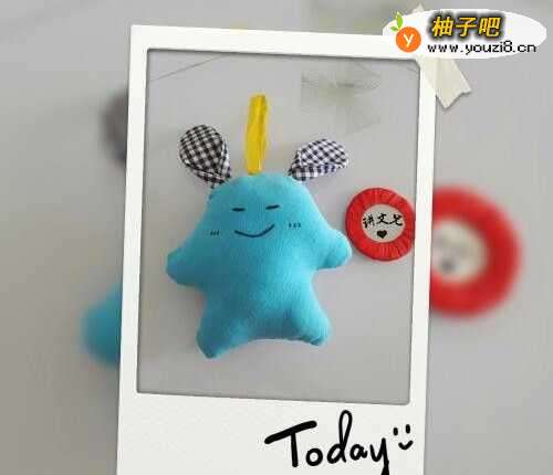 12最后,在蓝胖子头顶的中间位置缝上一条对折的黄色丝带,蓝胖子就可以被吊起来了~其实在译侧缝合两片主体布片的时候应该把丝带加进去缝起来的,可是做的时候忘记了
