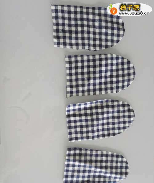 3接下来用格子布剪出四片大小一样的耳朵部分,我是先剪成长方形,然后再把称陕一个短边修剪成半圆形状~