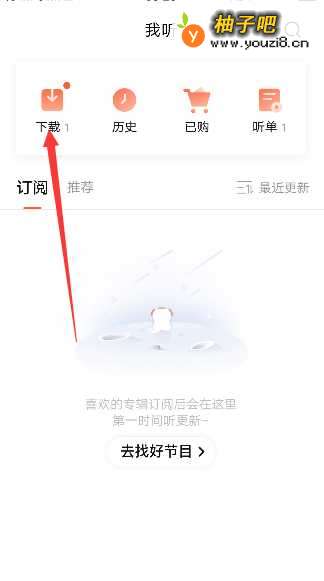 6在我听页面中,看到下载下面有个数字1,说明有下载文件,点击下载图标。
