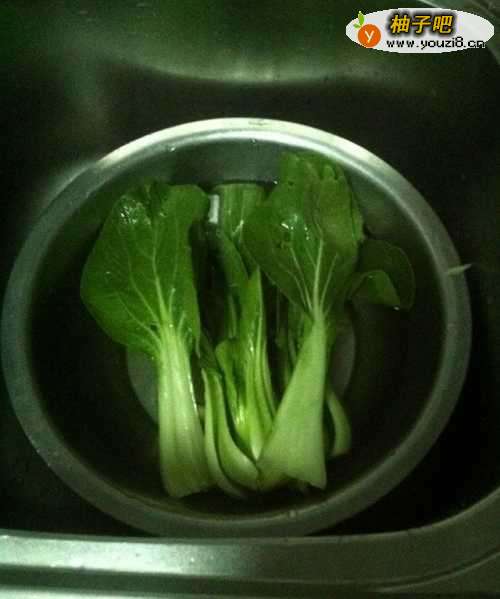 5水开后煮面,第一滚加小半碗冷水,放青菜,第二滚,捞出,盛碗中。