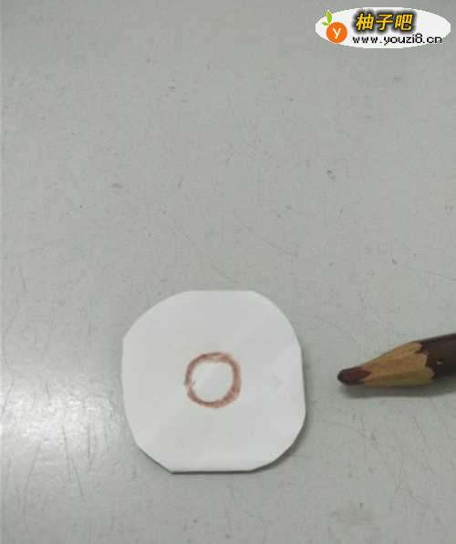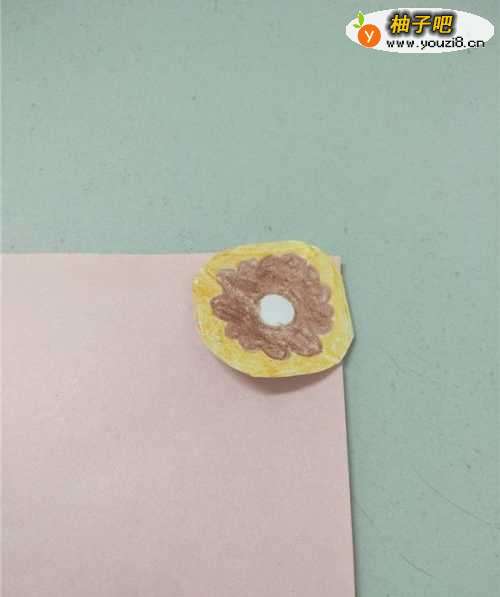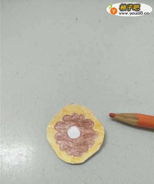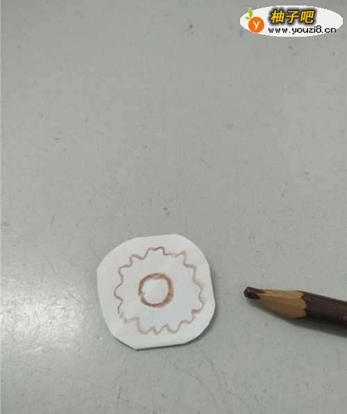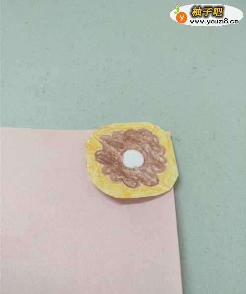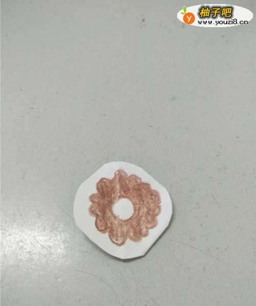 8用棕色彩笔在圆形中间画一个小的圆形,表示甜甜圈中间的孔。