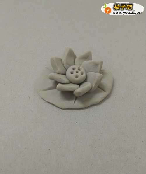 9把小圆球粘在八片花瓣的中间,当作荷花的花芯。