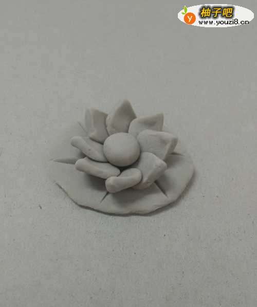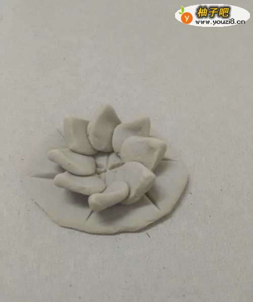 5把八个小圆球在手里按成圆形的扁片,用来做荷花的花瓣。