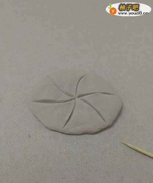 2先取一块面,在手里按成椭圆形的扁片,当作荷叶。
