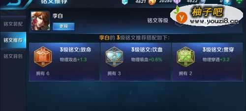 3铭文的搭配方法我分为两种,第一:按人物分,点击左侧的铭文举荐,就会进入人物界面,你想看哪个英雄的搭配方法就更换到哪个人物。