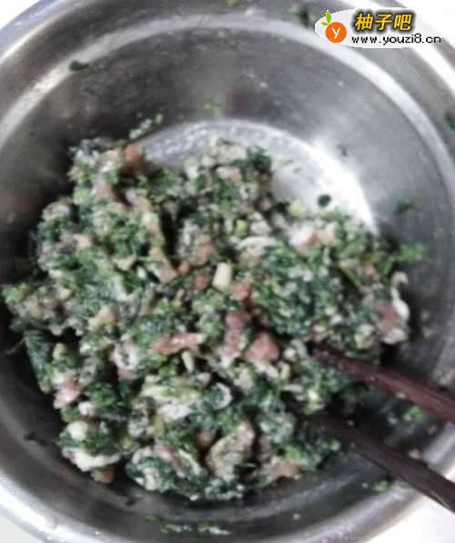 5将刚才切碎的荠菜馅子里放少许盐搅拌均匀,然后与肉糜馅混合在一起并搅拌均匀