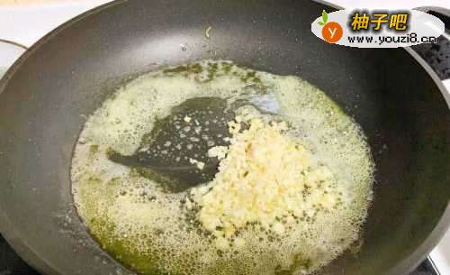 4用炒虾的锅,加入无盐奶油,用中火待无盐奶油融化,然后倒入蒜末、姜末炒香