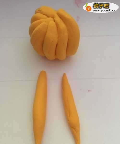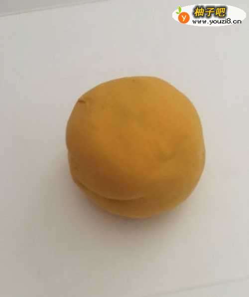 第一步 先用一大块黄色彩泥 团一个圆球 作为第一个南瓜的半成品