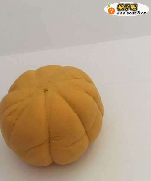 2第二步 把这个圆球 压扁一些 再用塑料刀具在上面 压出南瓜的沟痕