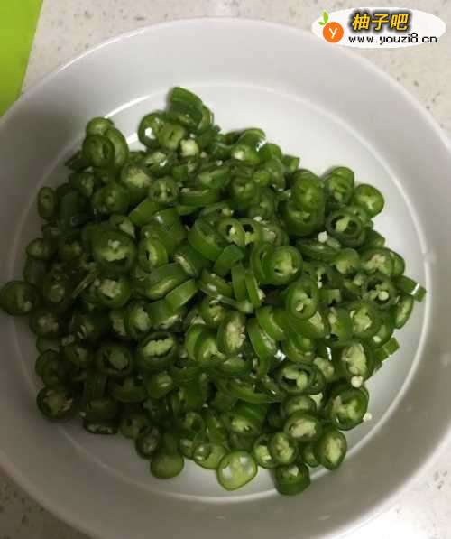 3放入切好的尖椒段,翻炒至颜色变翠绿发软(一定要炒至发软,不然不入味)