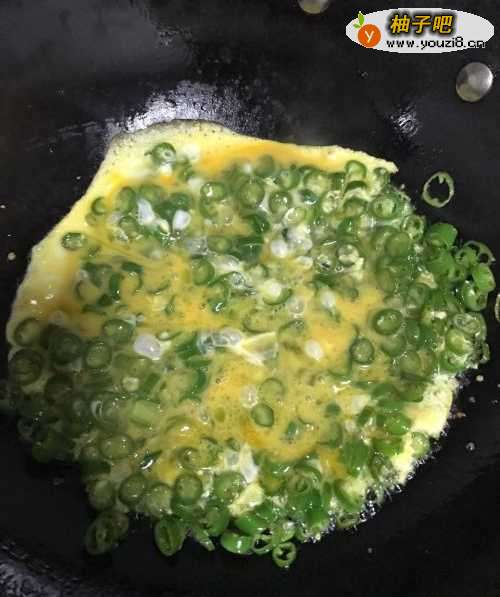 4将尖椒平铺在锅底,倒入打好的蛋液,保证每个尖椒段都裹着蛋液,改小火,待蛋液快要干时,翻炒,加入一勺盐。