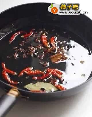 9油锅先用姜末爆一下,然后放入干辣椒、辣椒粉、花椒、桂皮、八角、糖炒至香味四逸,放入酱油和一小碗水烧至沸。