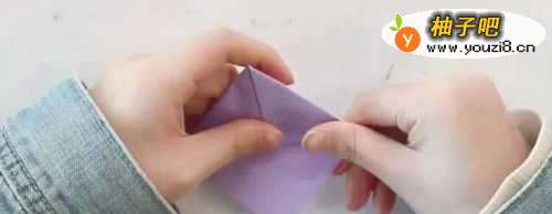将正方形彩纸沿着对角线对折成三角形,两底角往上对齐顶点折叠。