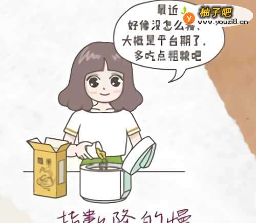 3指数降的慢:减肥之初,天天瘦,美滋滋,可突然有一天就发现,体重秤上的数字,怎么就不动了?!这个时候千万不能病急乱投医,你可以多摄取一些B群维生素、多喝水、早睡觉,这些都可以让你更快地突破平台期,再瘦一回!