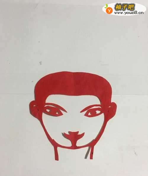 一个男孩头像的裁剪 和之前女孩的头像裁剪基本相同 同样是眼睛靠在发髻 嘴巴连接在下巴位置 民间剪纸一贯如此 下面我们就用红色彩纸 裁剪一个酷酷的 朝气蓬勃的男孩头像